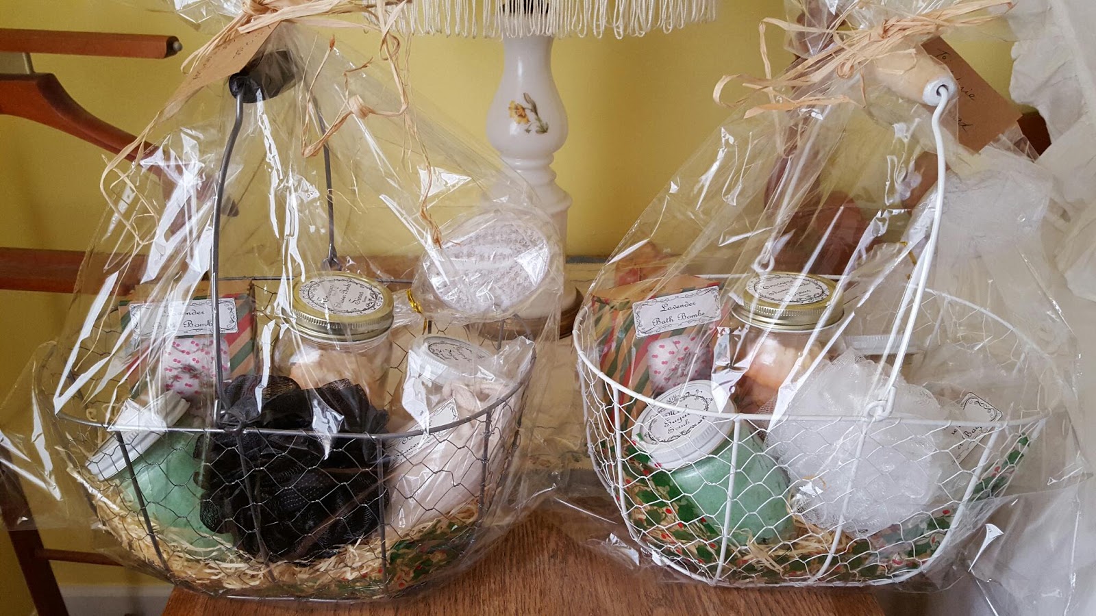 The gift baskets for the daughter and daughter-in-law. Made Grapefruit Sugar Scrub (w/our own fresh squeezed grapefruit juice), Mint Sugar Scrub (w/ fresh mint), Sinus Shower Bombs, Energizing Shower Bombs, Lavender Bath Bombs and Oatmeal Shower Bags. Added a pouf and a brush. Awesome!